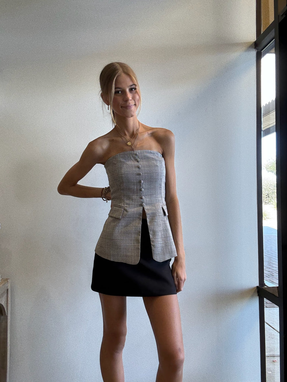Lia Strapless Plaid Button Front Top