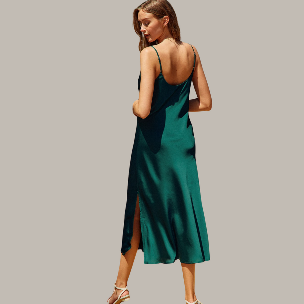 The Camilla Satin Slip Dress; its simply elegant design features a side slit, adjustable spaghetti straps, and a midi length for a sophisticated silhouette. Elevate your wardrobe with this exclusive piece, perfect for any special occasion.