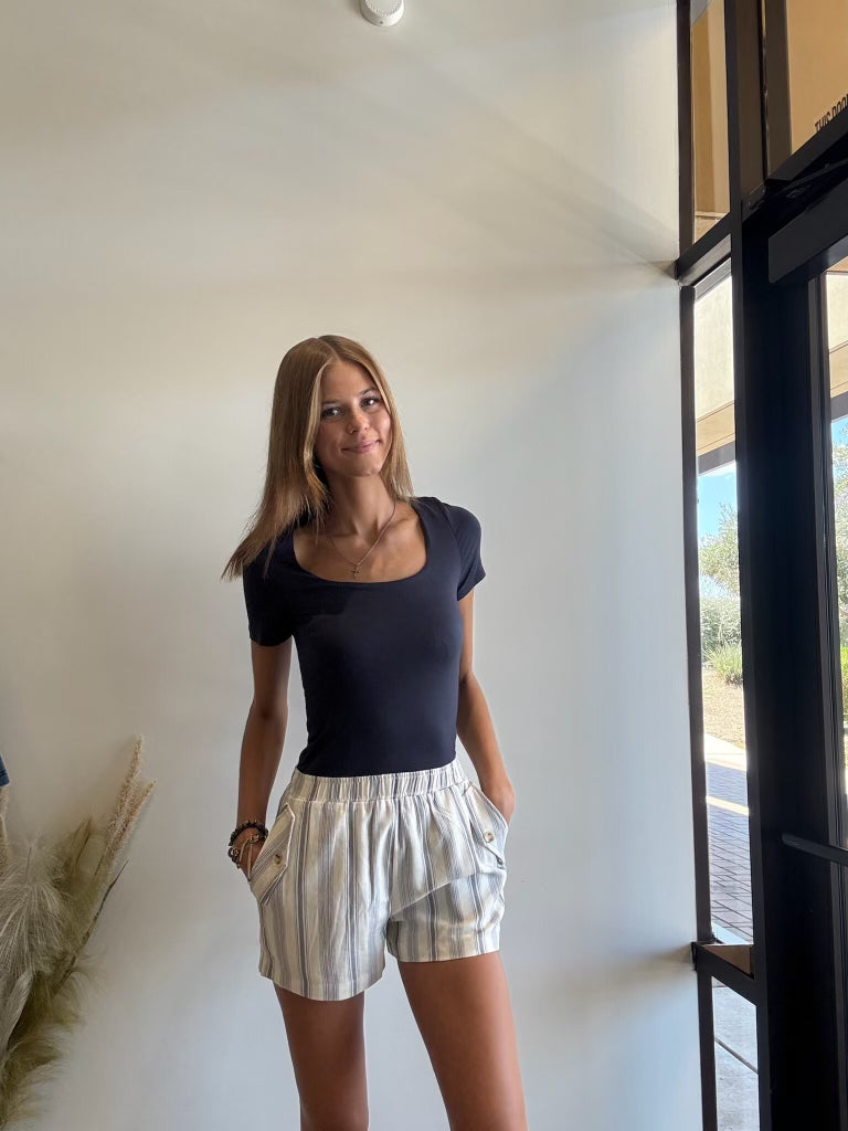 Simple neutral linen short with tie elastic waist and gold metal detail, best paired with it's matching blazer.