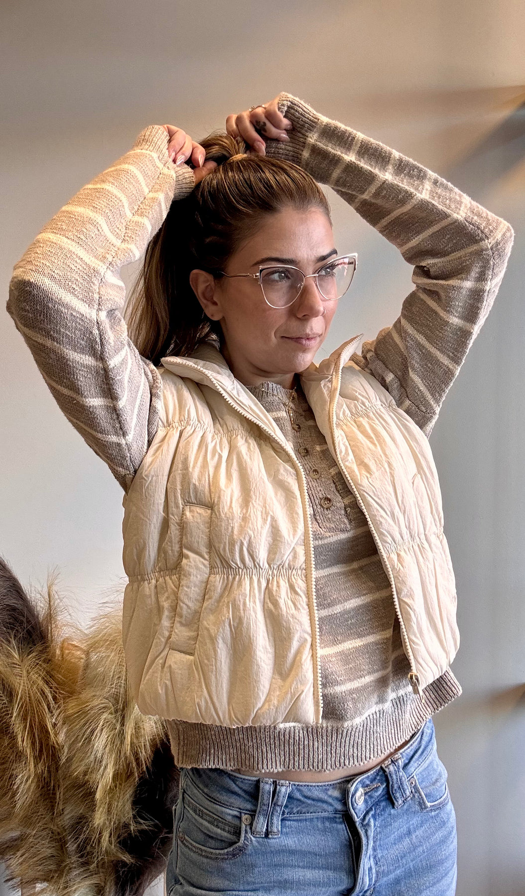 The Tara Zip-Up Crop Puffer Vest Top offers a refined approach to winter warmth. Its cropped design and zip-up front provide just the right amount of insulation to layer effortlessly without the bulk of sleeves. Ideal for elevating your fall and winter wardrobe, this vest blends function with sophisticated style, making it a versatile piece for cooler days.