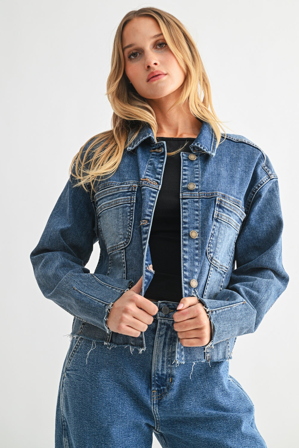 The Jena Worn Crop Denim Jacket offers a sophisticated take on classic utility style with its medium wash and relaxed fit. Designed with functional pockets and a distinctive frayed hem, it evokes a refined yet effortlessly edgy look. Perfect for layering, this jacket enhances any outfit with subtle character and timeless appeal.
